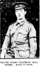 Harry Raistrick (Service No 2012) was born in Bradford, England about 1896 and travelled to Australia. At the time of enlistment he was a single 19 year old grocer who was living at Scarborough, NSW. He embarked on HMAT A55 Kyarra on 13th April 1915 with 5th Reinforcements, 3rd Battalion.